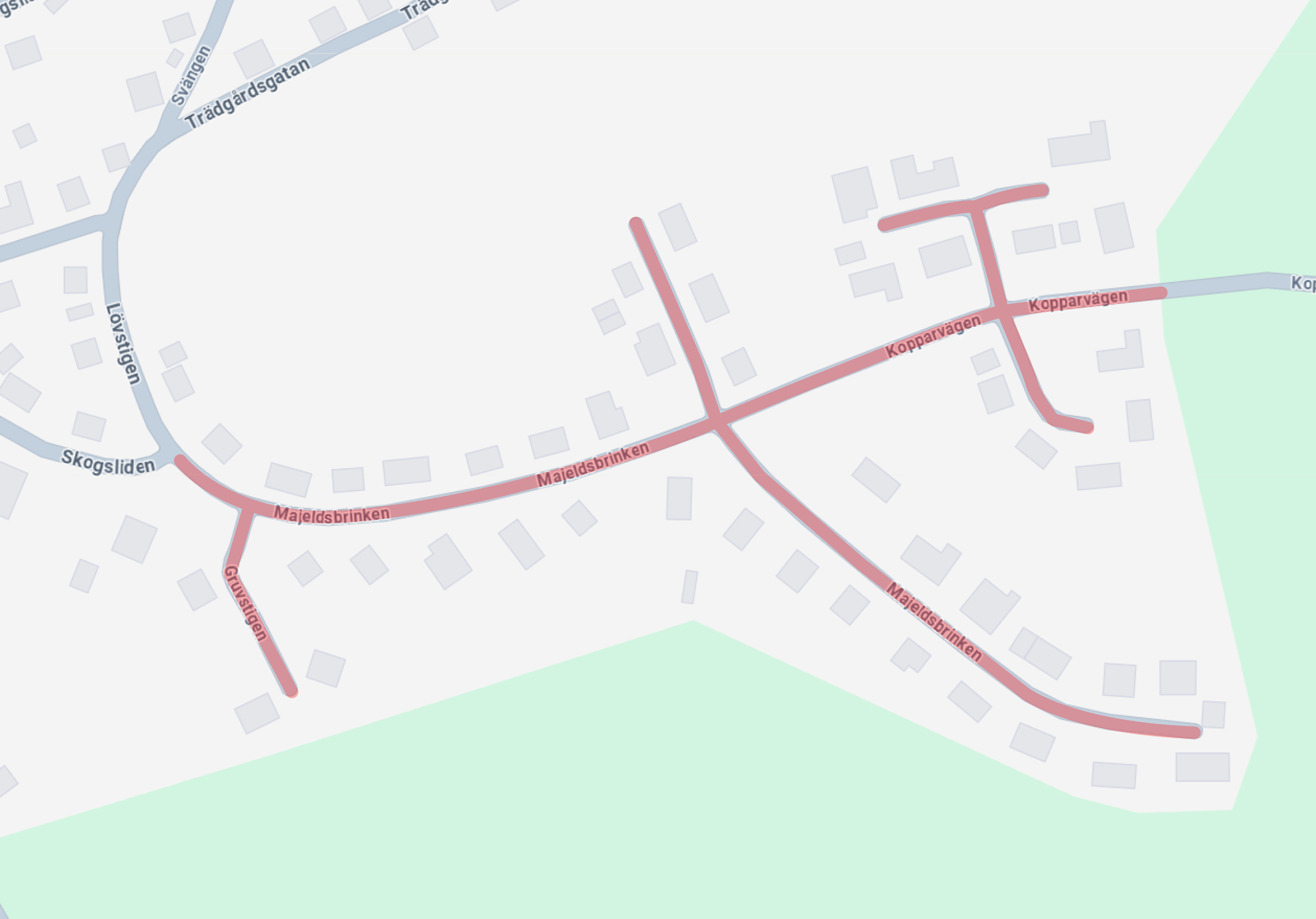 Arbetet berör Gruvstigen, Majeldsbrinken, Majeldsvägen och Kopparvägen och kommer att påverka framkomligheten i området under tiden. Se kartbild.
